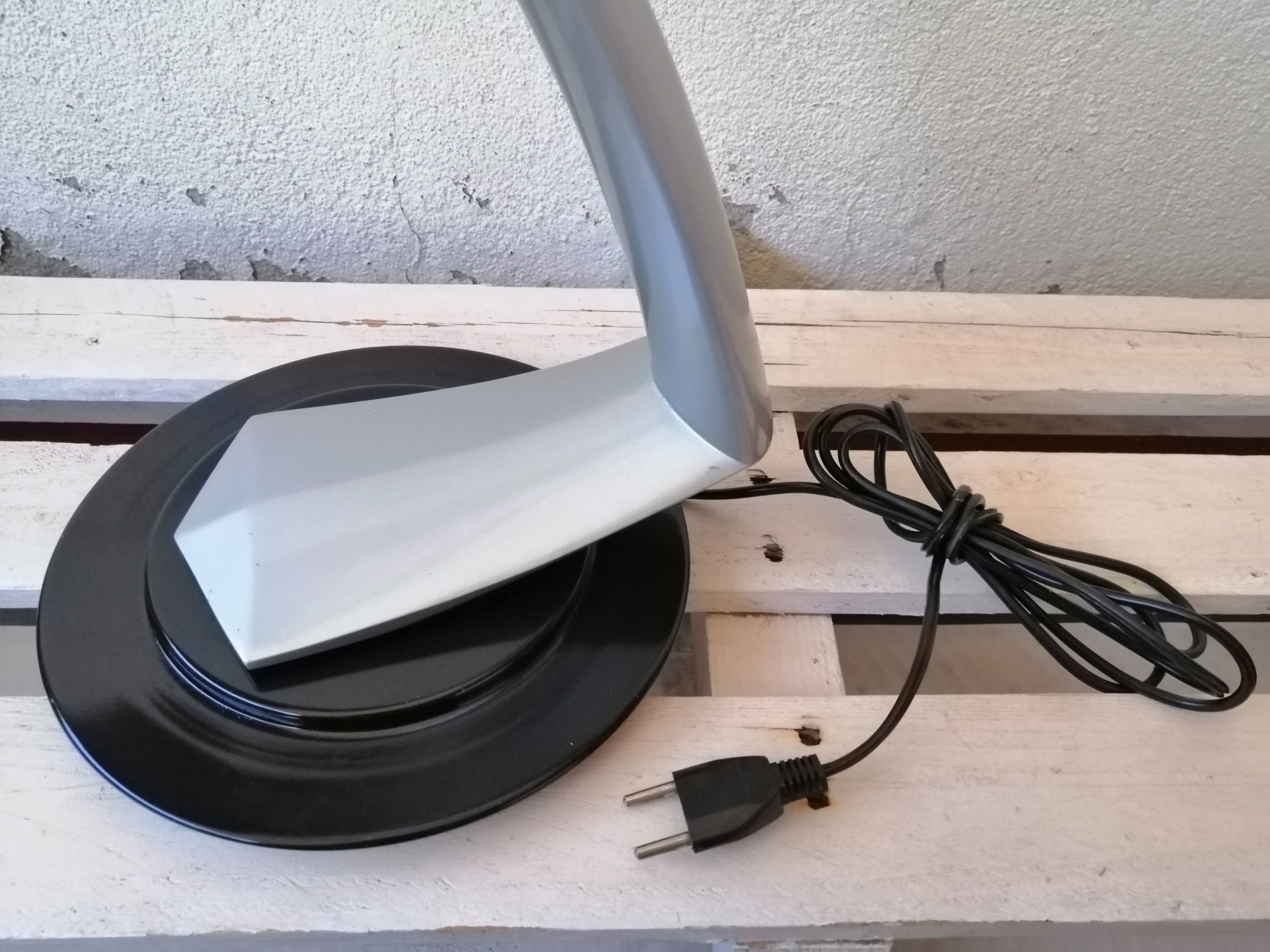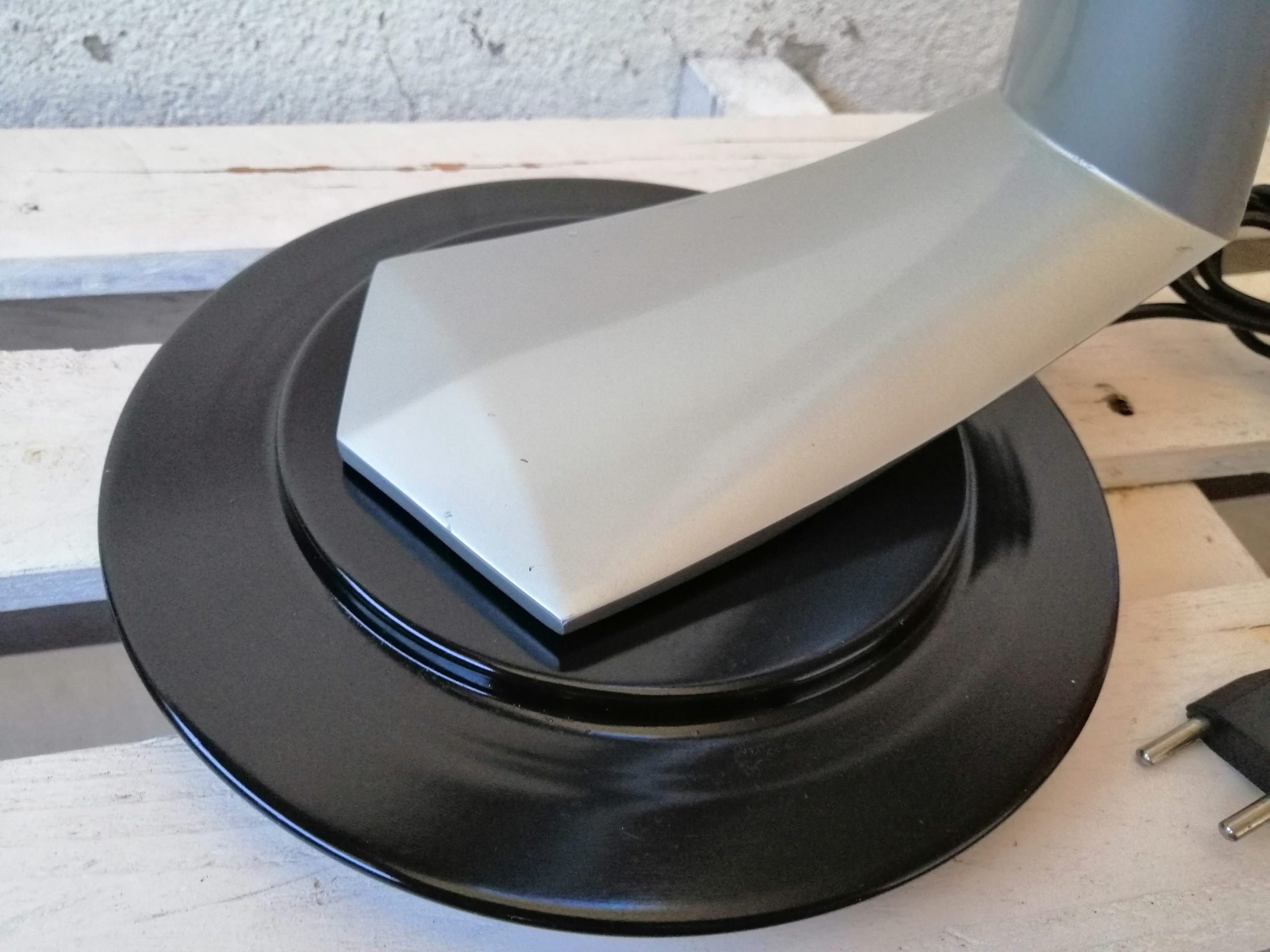 Lámpara de despacho vintage FASE, modelo Boomerang 2000 o Arco. Base y pantalla en metal lacado negro, brazo en gris metalizado. Diseño de los años 60-70. El pie gira sobre la base, y la rótula de la pantalla permite distintas posiciones.