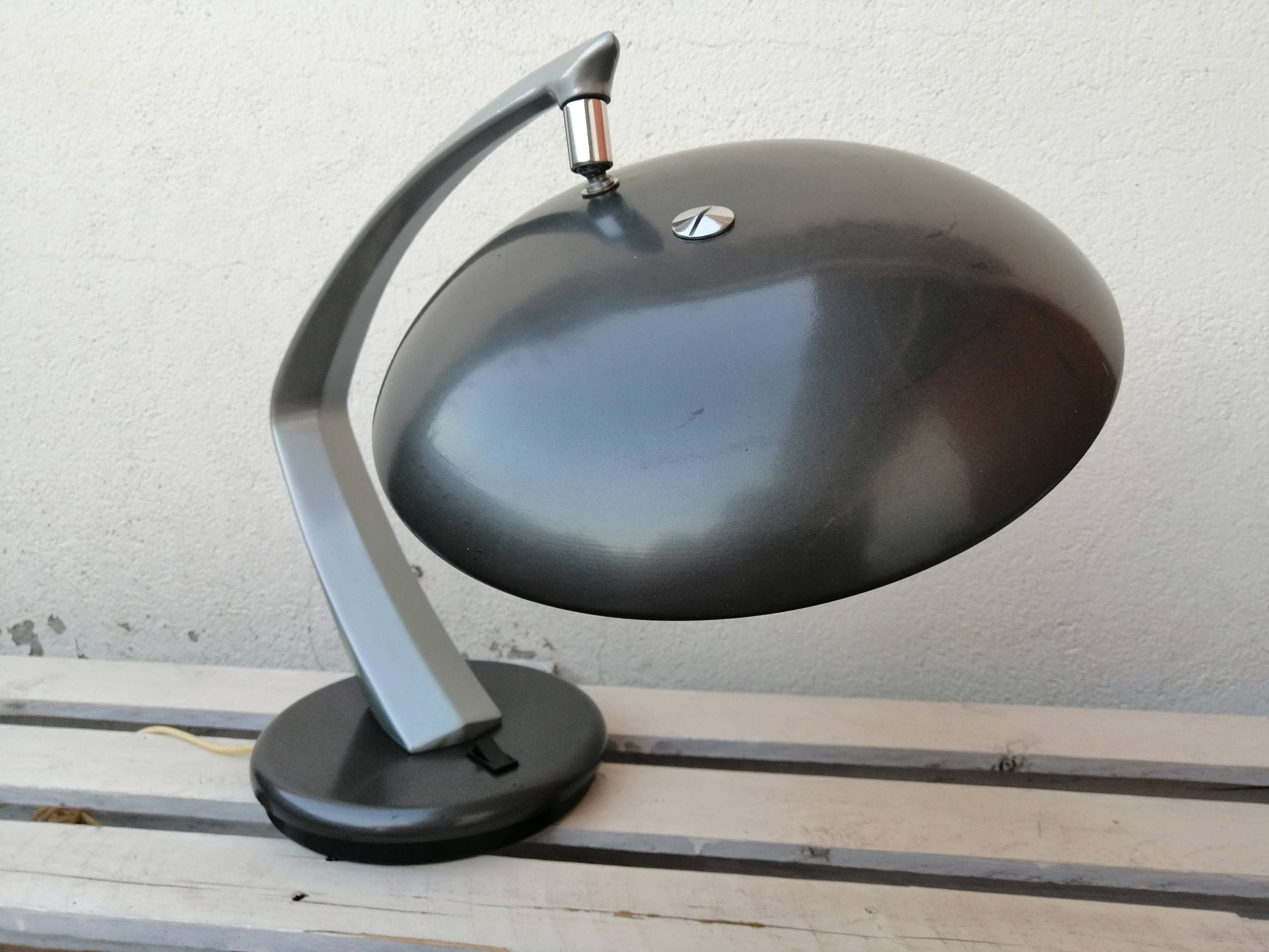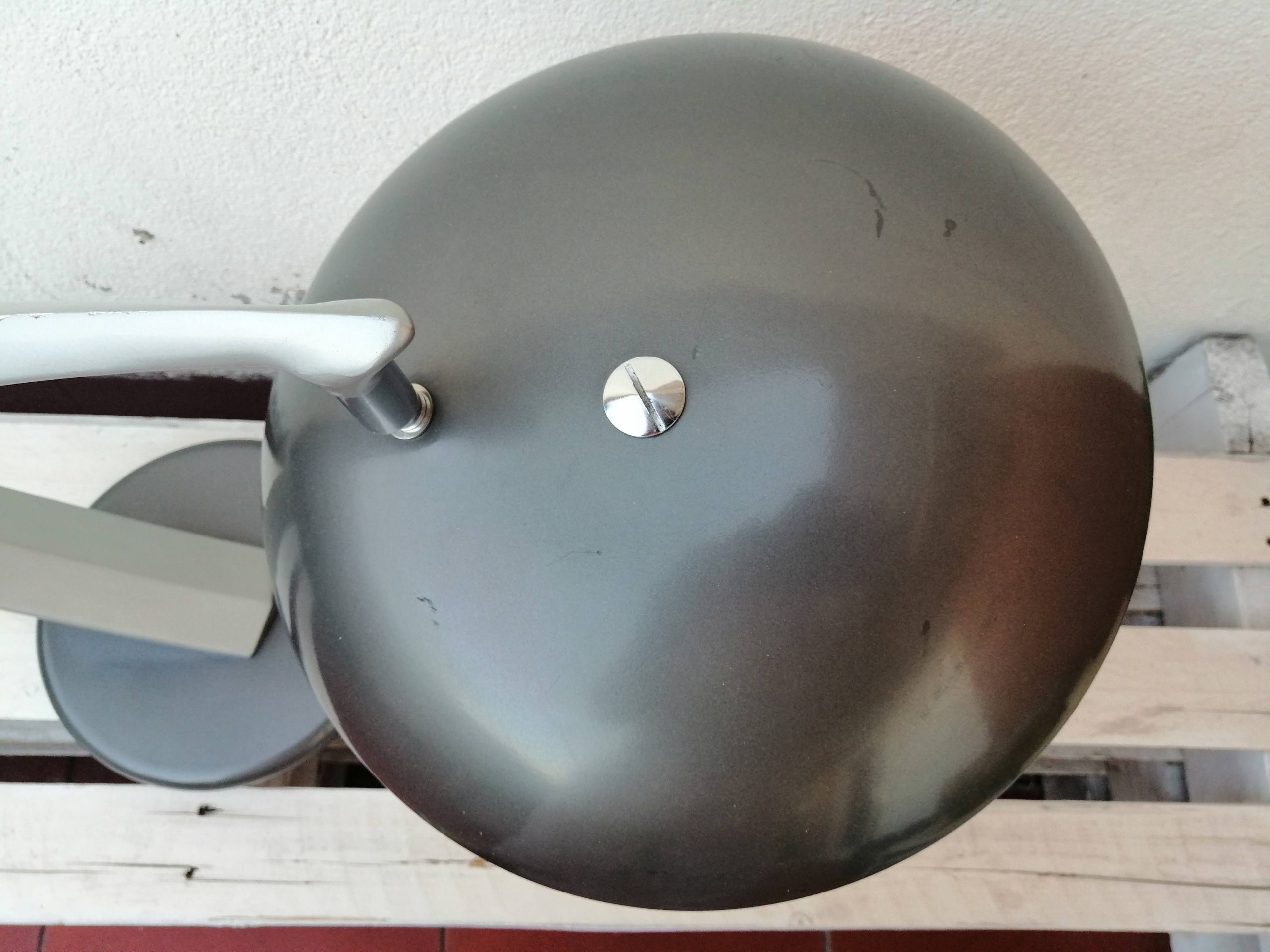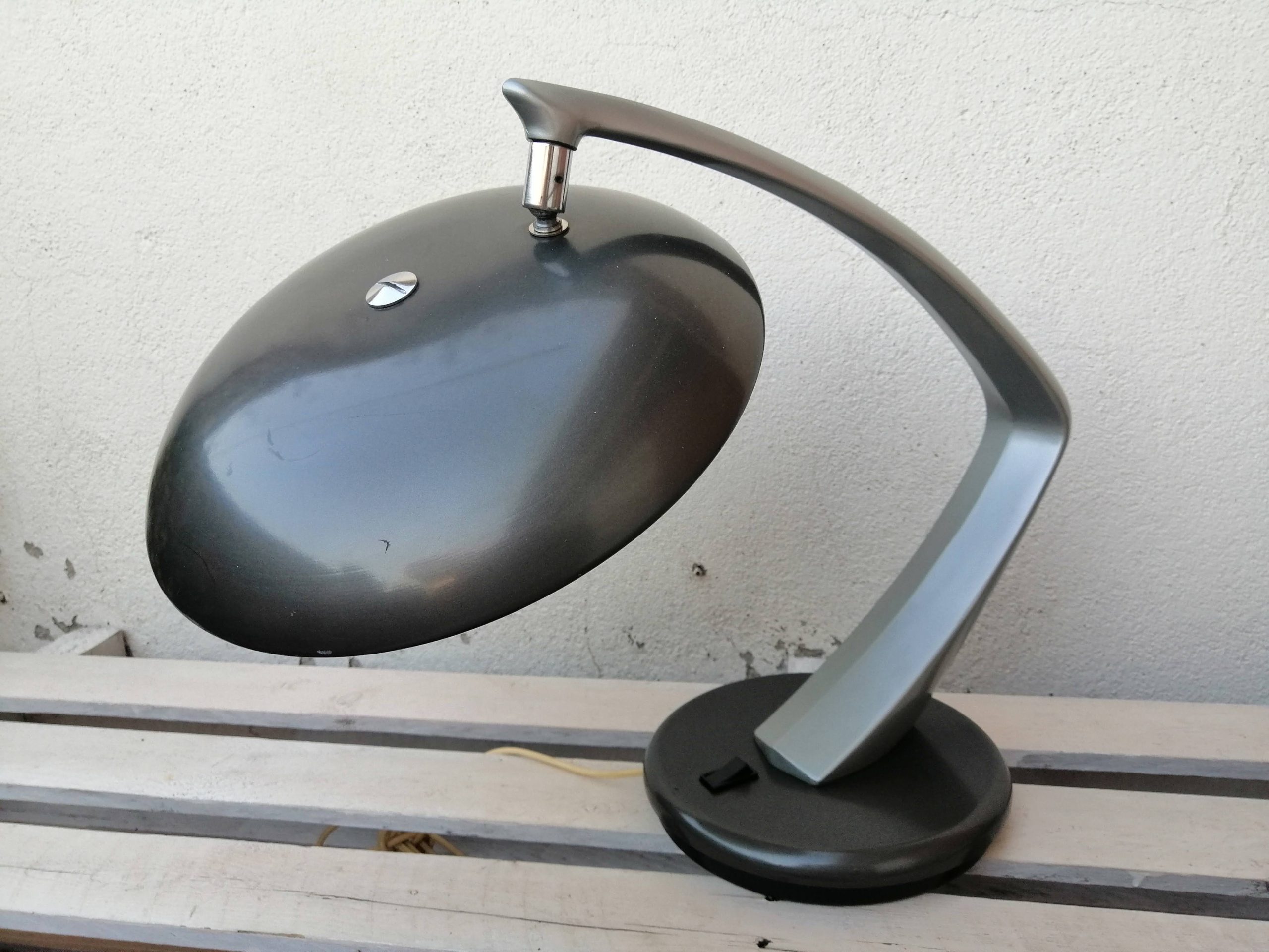 Lámpara de despacho vintage FASE, modelo Boomerang 64. Base y pantalla en metal lacado gris oscuro brillante, brazo en gris claro metalizado. Diseño de los años 60-70. El pie gira sobre la base, y la rótula de la pantalla permite distintas posiciones.