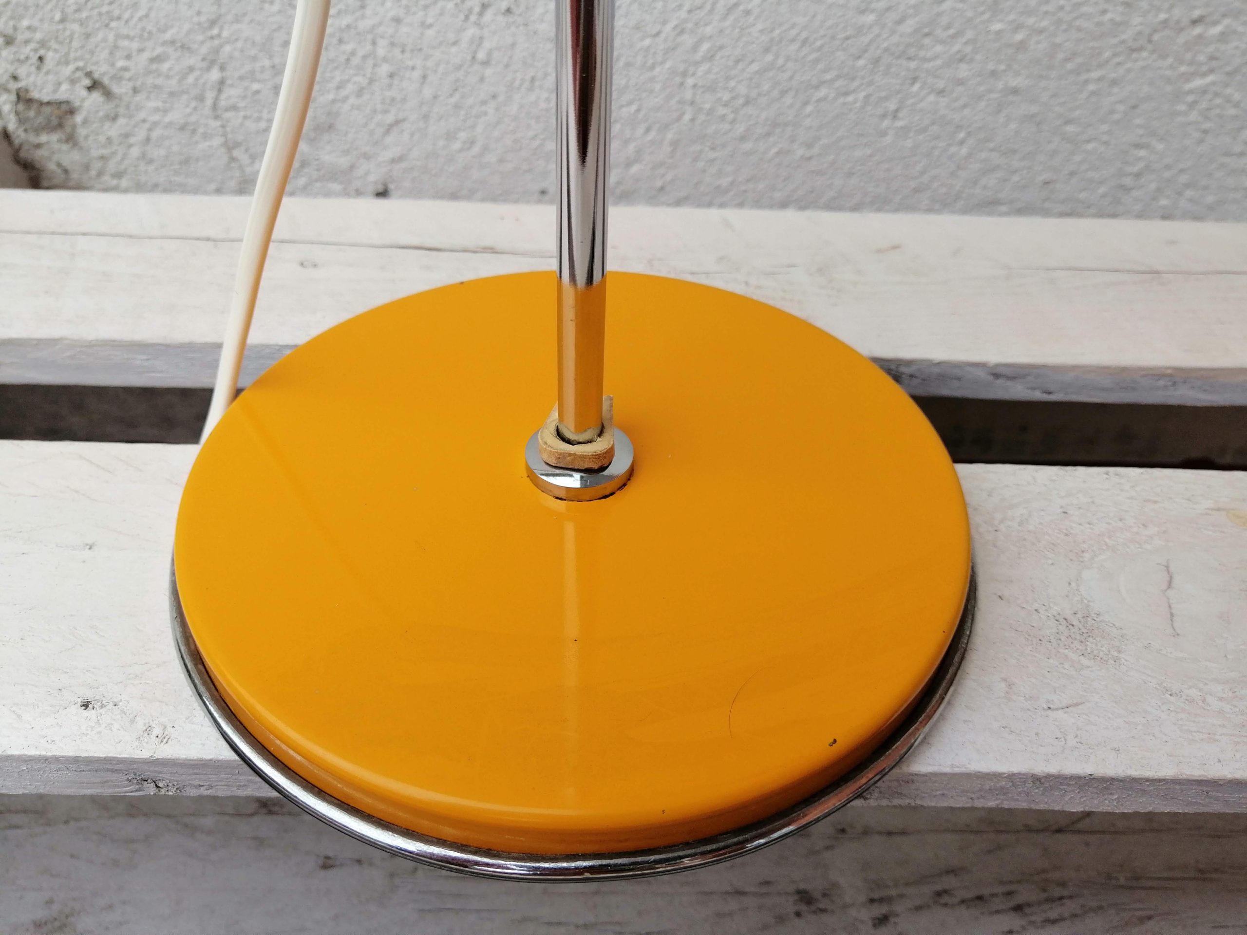 Lámpara de mesa / escritorio o flexo en metal lavado color amarillo intenso y cromado, fabricado en España por Macià. Tulipa regulable en altura y orientación, interior blanco.