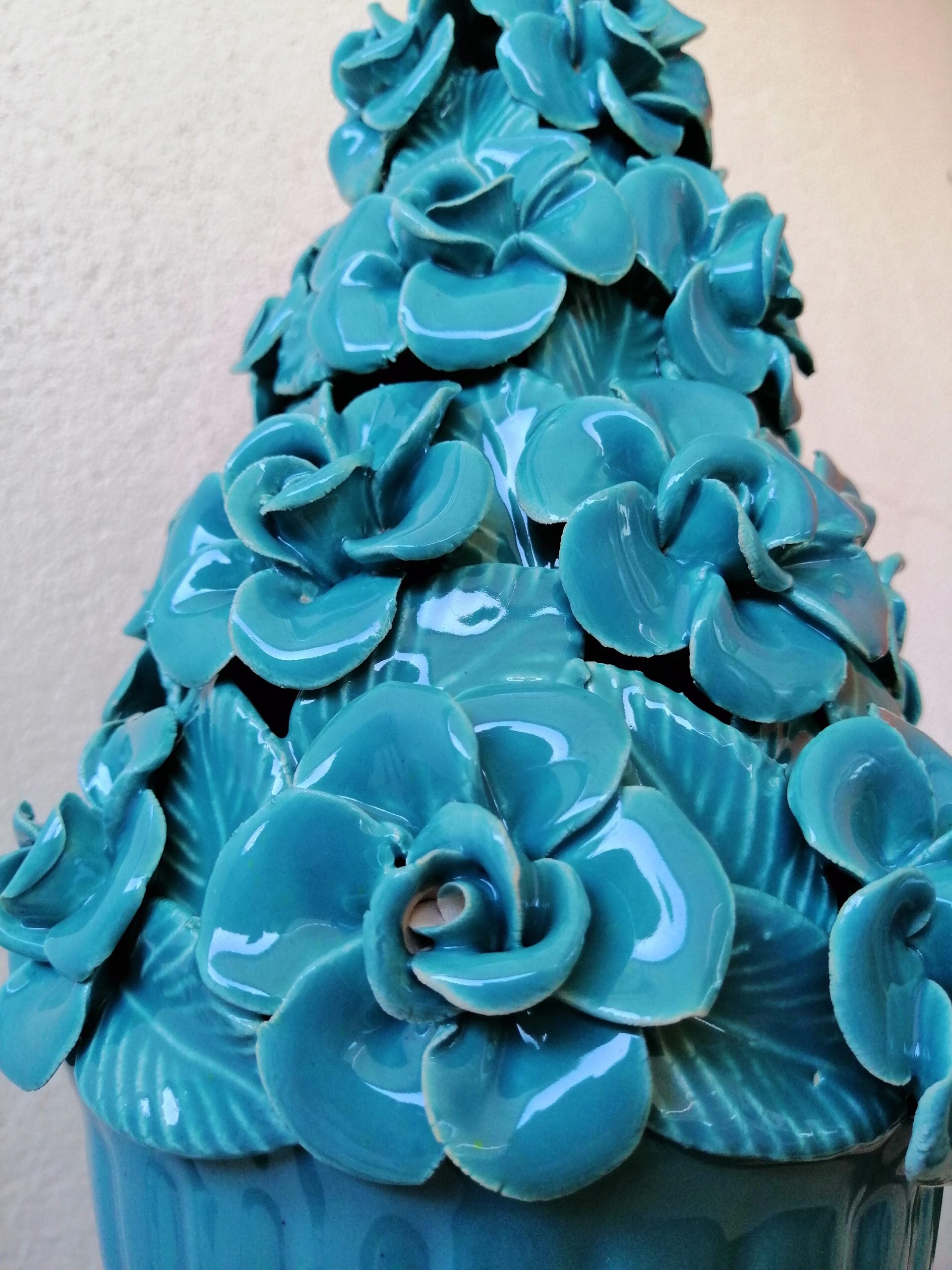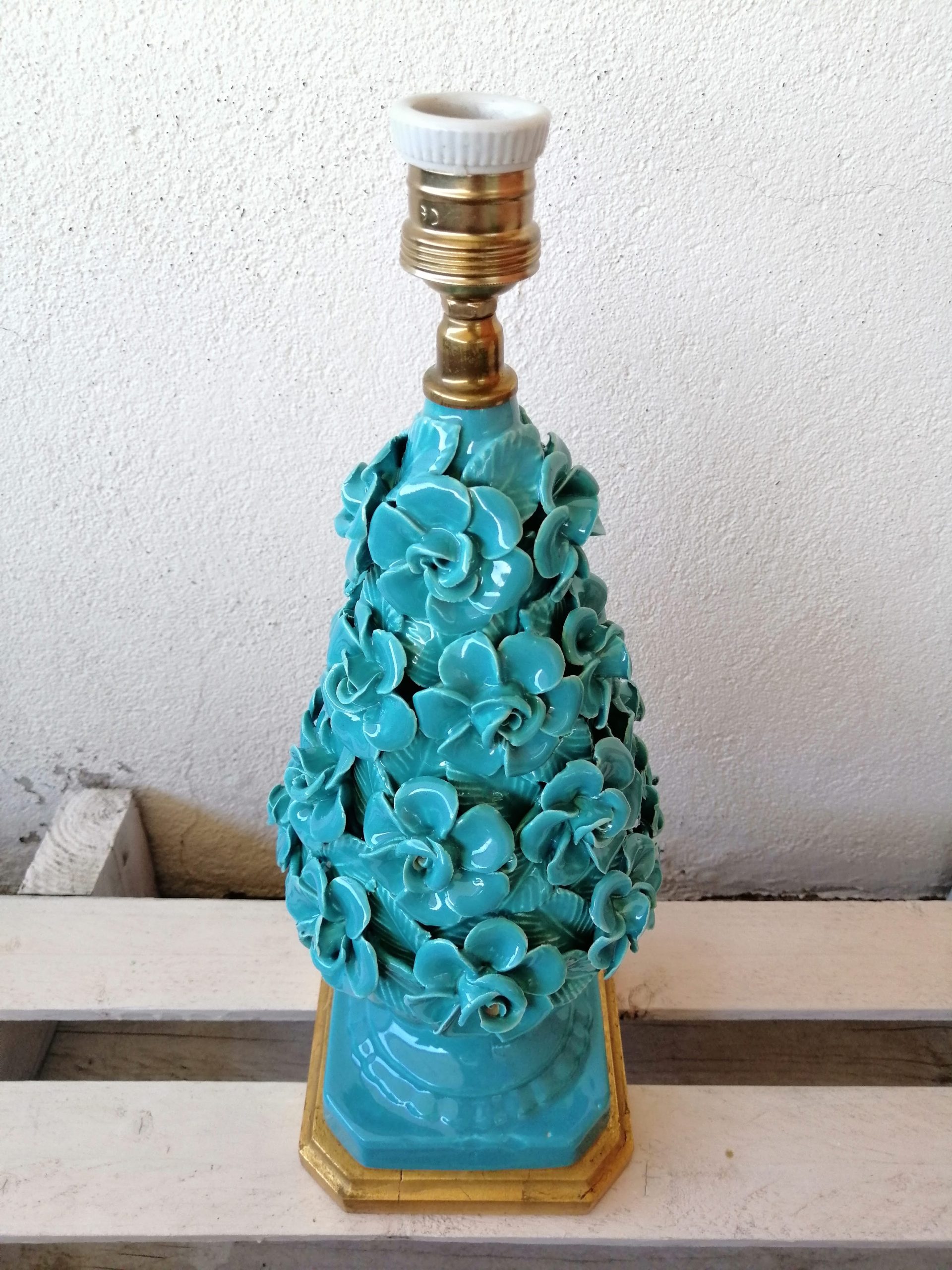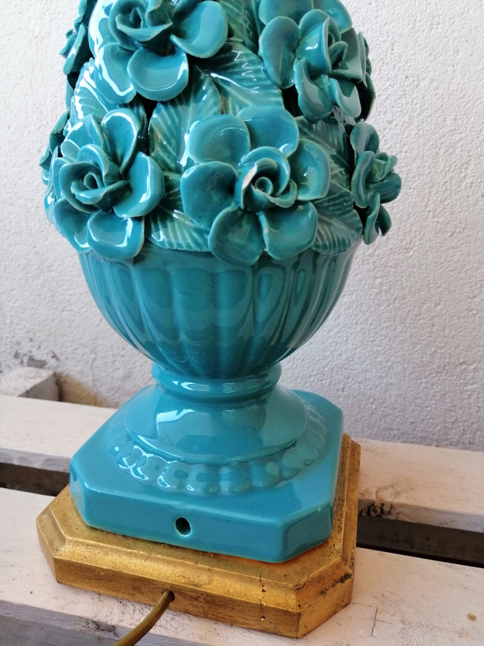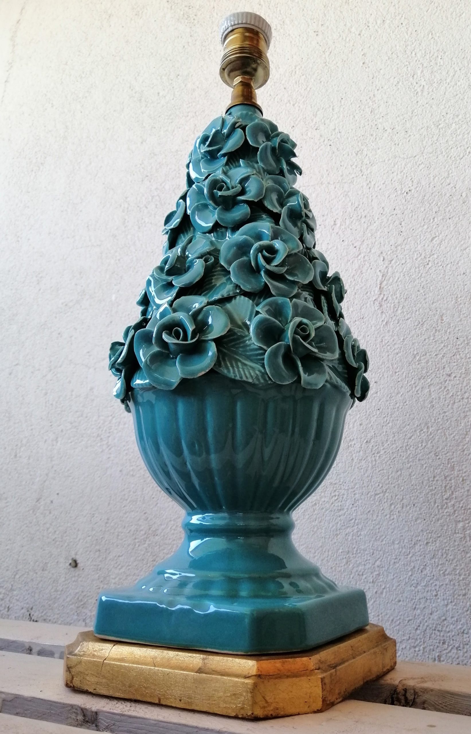 Lampara de mesa antigua, de porcelana/cerámica de Manises (Valencia) con diseño en forma de jarrón adornado con flores, en color azul intenso brillante. Peana de madera con acabado en pan de oro (dorado original). Años 50-60.