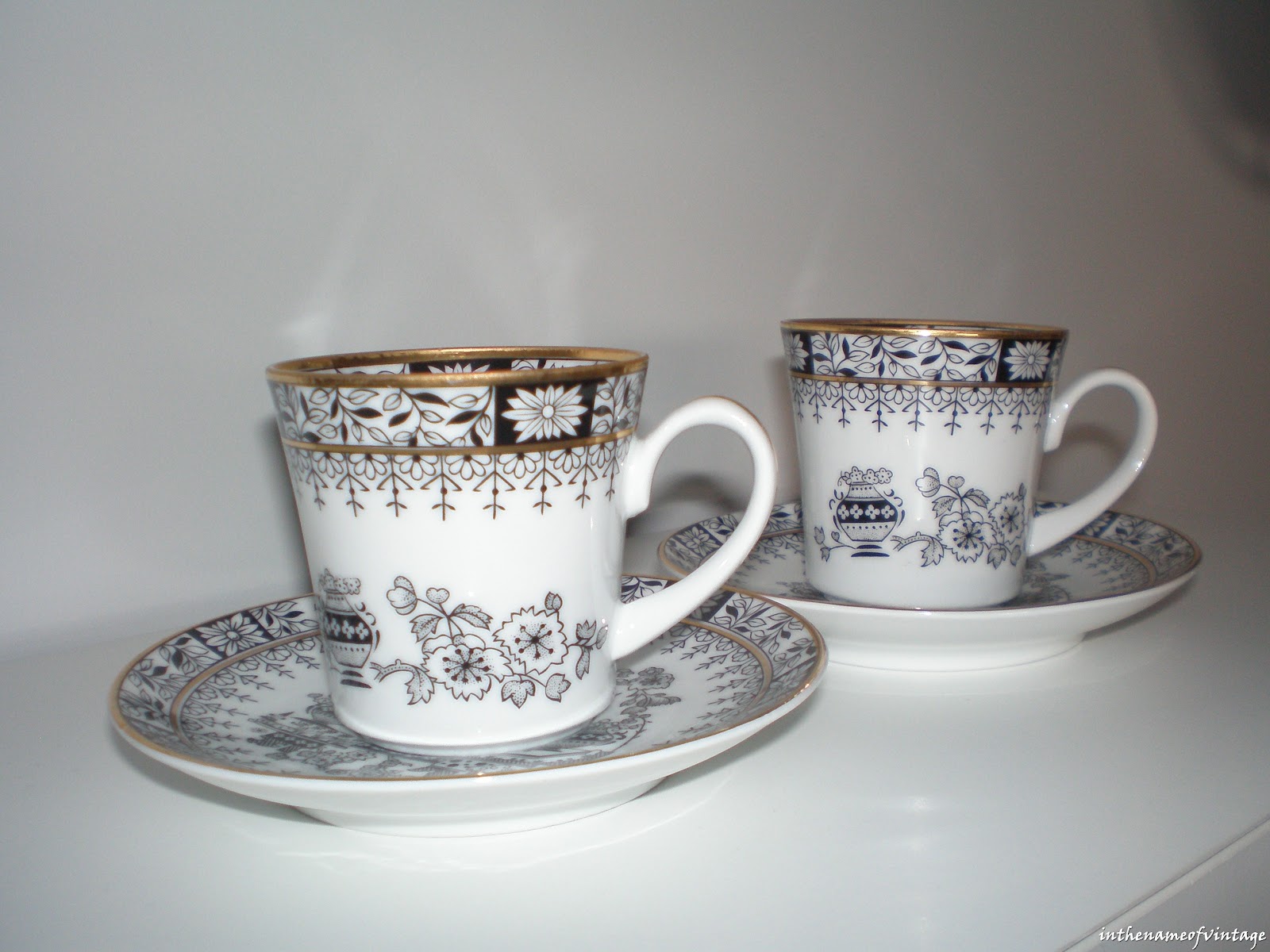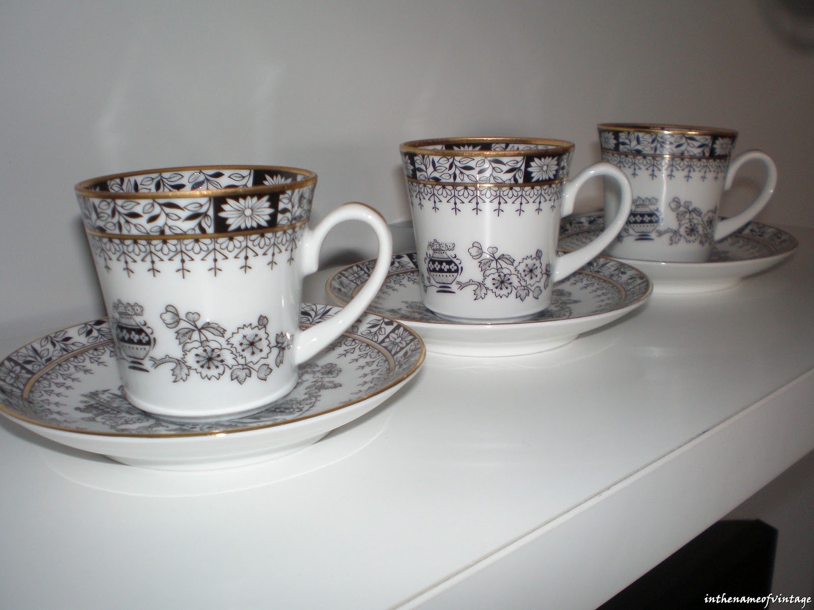 … y así hasta 12 pequeñas tacitas de café de porcelana, con su platito a juego, de la marca Santa Clara (Vigo), de los años 60 o 70. (**si quieres saber algo más de su historia puedes pinchar en el enlace). / … and so until 12 small porcelain coffee cups, with matching saucer, Santa Clara brand (Vigo) of the 60’s or 70’s. (** if you want to know more about your story you can click on the link).